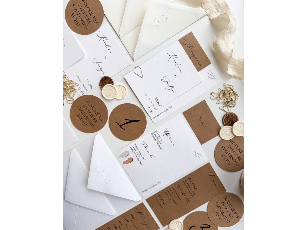 Jemné romantické svatební oznámení Adelaide na bílém Vintage svatebním papíru s gramáží 290g/m2 a na kraftovém papíru o gramáži 300g/m2. Toto oznámení je na bázi "skládačky" kdy si zvolíte různé kombinace, které Vám rádi pomůžeme vymyslet tak, aby na sebe seděly co nejlépe.