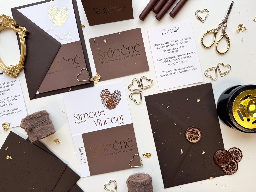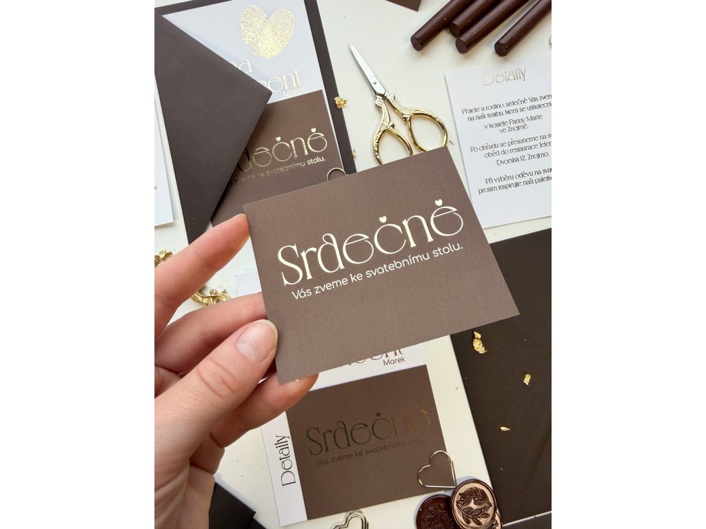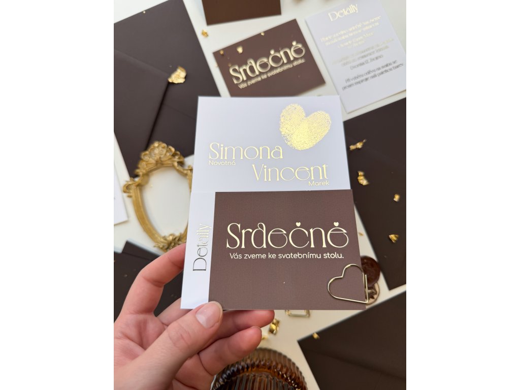 Elegantní svatební oznámení Srdíčko na bílém sametově hebkém svatebním papíru s gramáží 290g/m2 a hnědém sametově hebkém svatebním papíru s gramáží 290g/m2.